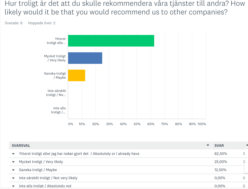 Vi har precis skickat ut vår kund-/marknadsundersökning i vårt arbete där vi nu ska utveckla våra tjänster och hemsida! Väldigt glada över svaren hittills (se bild för svar på några nöjdhetsfrågor, och alla kunder som jobbat med oss och svarat hittills skulle rekommendera oss till andra företag)!